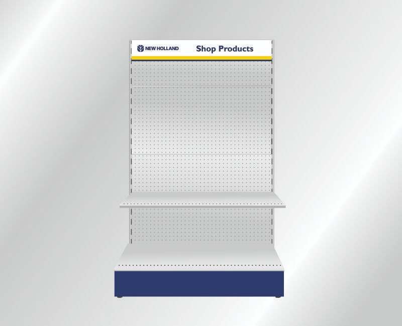 This Feature End is 1400mm high x 900mm wide, Oyster Grey with blue kickplates and punched metal back. Includes 470mm base and a 400mm over base shelf as well as capping, kickplates to front and sides.